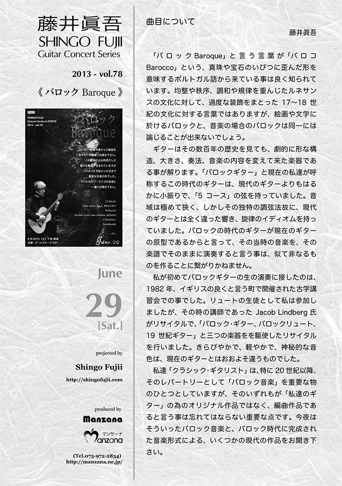 私達「クラシック・ギタリスト」は、特に20世紀以降、そのレパートリーとして「バロック音楽」を重要な物のひとつとしていますが、そのいずれもが「私達のギター」の為のオリジナル作品ではなく、編曲作品であると言う事は忘れてはならない重要な点です。今夜はそういったバロック音楽と、バロック時代に完成された音楽形式による、いくつかの現代の作品をお聞き下さい。