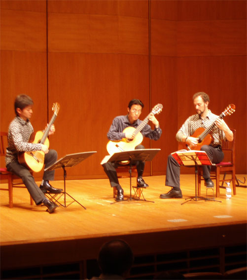 京都公演では関西在住の若いギタリスト達(大阪音楽大学での私の教え子達)が手伝ってくれました。 ユニークなホームページをつくっているのが「ポンタ」こと、西尾純平君。「ポンタのお話」はフィクションとノンフィクションの混在した、なかなか面白いお話で、《天使の協奏曲》から「公開レッスン受講」の話まで満載です。