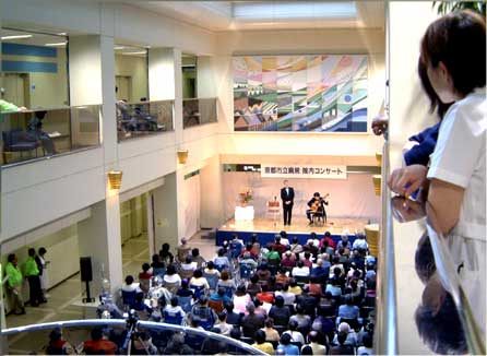 うっかりしていました・・・、上床さんの本業は京都市立病院の循環器のお医者さん(総診療部長)です。 ですから会場には上床さんに診療してもらってる人も沢山居るわけです。また今回の演奏会のことが京都新聞でご案内いただきましたので、新聞をご覧になって「あ、上床先生が歌われるんだ!」と 驚いて駆けつけた人、またかつて治療をしてもらっていた人なども沢山いらしていたようです。あらかじめ聞かされていたこととは言え、開演間近になると会場となるロビーは車イスの人や、点滴をしながらベッドに身を横たえている人などが、一階にも、そして吹き抜けの二回にも沢山見かけられました。もちろんこの雰囲気は私にとっていつものコンサートとかなり違うものです。かつて何度か、大分県佐伯市の南海病院と言うところでこのようなコンサートをしたことがありますが、こちらは院内に小ホールを持ってられて、雰囲気は普通の演奏会と殆ど変わらないものでした。ですからステージに立ったときには、今目の前にいる人達の中には病室からここまで来るのにも大変な苦労をして、あるいは一人でここまで来られた人は一体何人居るんだろうか、と言うことを考えたり したのでした。ところが一瞬、隣に立っている上床さんのことを考えてみたら、彼にとっては会場の殆どの人が、誰であるか分かるだろうし、名前も顔も、そして健康状態のことも分かる訳ですから、心中の複雑さは私を張るかにしのぐものであったことは想像に難くありません。