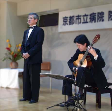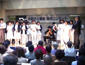 演奏会は途中にギターの独奏で「禁じられた遊び」と「アルハンブラの思いで」、そしてトゥリーナの「セビリア幻想曲」をはさみ、前半に海外の民謡やよく知られた歌、後半に日本歌曲を演奏しました。また「紅葉」では病院の看護士さん達との合唱、そして会場の全員での合唱も楽しみました。演奏が終ると、沢山の方々から花束を頂戴しました。中には京都新聞を見て駆けつけた方もいらしたようで、上床さんのおかげで健康を取り戻した喜びと音楽を聞いた感興から、花束を手渡しながら涙ぐまれる方もいらっしゃいました。礼奏として「この道」を演奏しました。