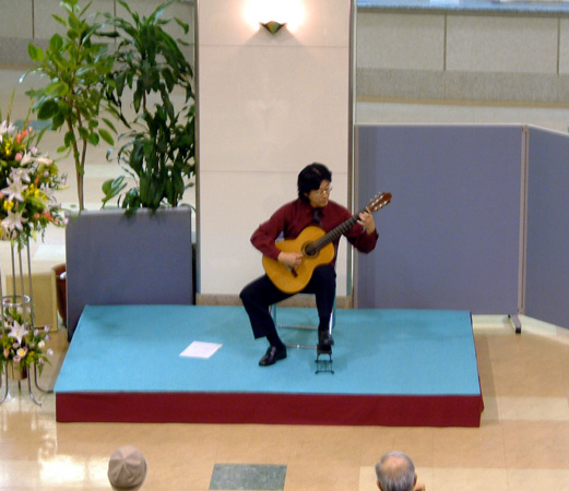10月29日に京都第一赤十字病院で「院内コンサート」終了いたしました。病院関係者ばかりが聞かれるのかと思っていたら、そうでもなくって、どう見てもギターをやってるなという雰囲気の学生風の若者、食い入るように手元をのぞき込む中年の男性など、様々な方々がいらっしゃいました。赤十字病院のロビーはほど良い響で、プログラムが進むに連れて聞いている人達が集中してくるのが分かり、楽しいひとときでした。(藤井眞吾)