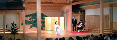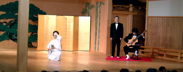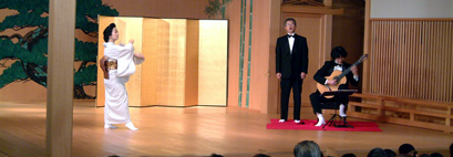 リハーサルではクラシックのコンサート会場とは違う響きに慣れるようにと、また「荒城の月」では若柳富久陽さんが「立方」として共演して下さいますので、その段取りなどを確認しました。そして今回始めて演奏する曲の「小さな空(作詞・作曲/武満徹)」を少し入念に練習をしました。会場は最近のクラシック音楽の会場のように豊潤な残響がある、というわけではなく、むしろどちらかというと「デッド」な響なのですが、舞台が木ですから音の反射は素直で、柔らかく、私はこういう会場も実はとても好きなのです。残響のたっぷりあるコンサート・ホールは小さな「音のキズ」を隠してくれるので演奏しやすいのですが、演奏の極めて細部というのは不鮮明になりがちで、また演奏者固有の音色というのも伝わりにくくなりがちです。今日のような会場はギターの音の一つ一つまで客席に伝わるでしょうし、歌手にとっては音の余韻の作り方がとても難しいのですが、反面、奏者が「為したこと」は素直に伝わるという確信があります。 |