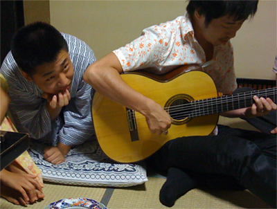 Wo Yo 君が最優秀に。櫻井正樹氏製作のギターを授与されました。彼は技術ばかりでなく、柔軟な音楽の理解力対応能力をけた外れに持っています。将来が楽しみです。左の写真は最後の夜、金氏のギターを試奏する沖氏の指先を食い入るように見ている