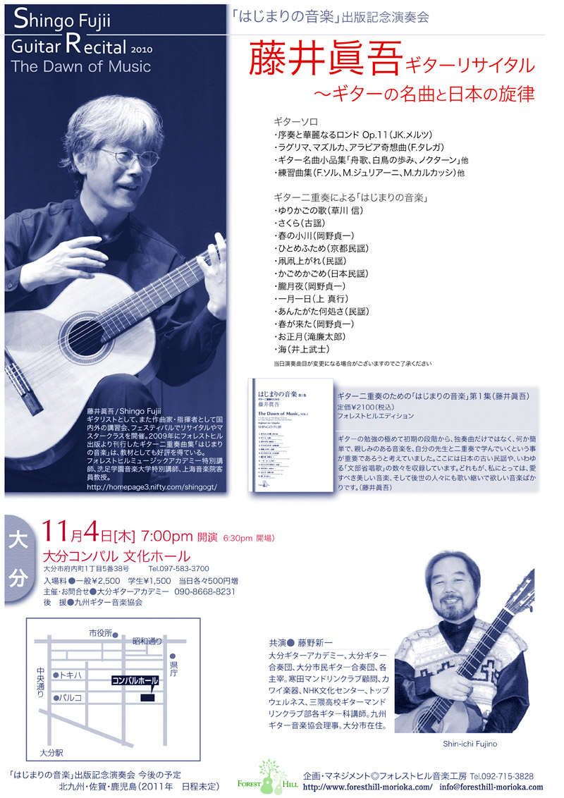ギター二重奏曲集「はじまりの音楽」出版記念コンサートシリーズ11月は、大分市です。曲集中の「ひとめふため」は京都地方の民謡ですが、実は大分県宇佐地方でもこの唄は古くから歌われているそうです。それはおそらく、宇佐神宮と京都の古いつながりによるものだと思います。共演いただきますのは大分ギターアカデミーの藤野新一先生。