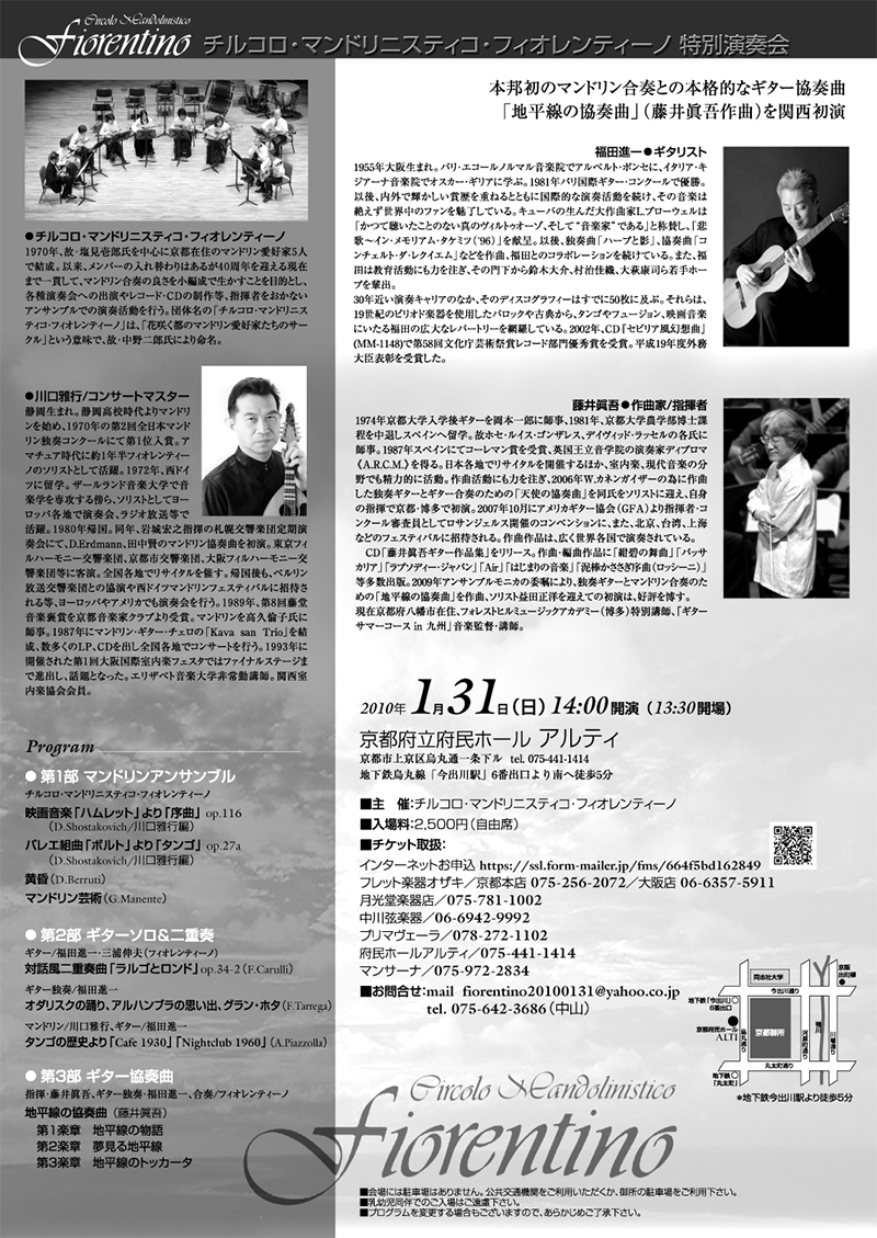 Horizontal Concerto」がいよいよ関西初演されます。演奏は京都のマンドリンアンサンブル団体「チルコロ・マンドリニスティコ・フィオレンティーノ」、長い歴史のある団体です。初演は2009年7月11日に東京で「アンサンブルモニカ」そしてソリストには益田正洋氏で行われましたが、今回は「指揮:藤井眞吾」「ギター独奏:福田進一」という顔合わせです。