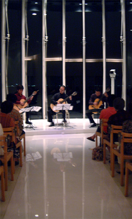 もう少しプライベートな観点を申し上げると、松下さんや池田さん達とは、これでにも何度も一緒に私の作品を弾いてもらったり、また熊本での夏季講習会ではいくつもの音楽を一緒にやってきた、という信頼があったので、彼等に残された時間がわずかであっても、作品の中からどれだけの音楽を引き出してくれるかという大きな期待があるわけです。岩崎さんは若いながらも既にスペインで相当のキャリアを積んでこられていますし、この三人が友人として強い信頼関係を持っていて、彼等が大きな情熱をもってこの演奏会に臨んで、また自由で闊達な発想が三人の会話からあふれ出ていて、私の作品に限らず演奏会全体がきっと音楽的なものになるだろうと強く感じさせていました。全くあたらし作品というのがいつの場合も演奏者にとっては幸福な存在であるとは限りません。しかし、演奏者がその作品と付きあう、というか、関わっている時間が有意義で、そして結果的に幸福なときであるようにという努力はいつも万全でなければならないのです。