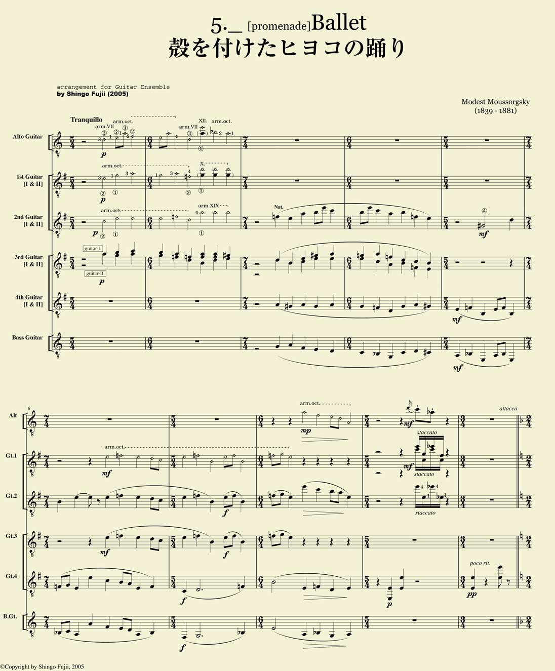 〜殻を付けたヒヨコの踊り」「バーバヤーガ」「キエフの大門」の7曲を編曲しました。編成は「Alto Guitar, Guitar1, Guitar2, Guitar3, Guitar4, Bass guitar」の6部編成。改めてこの曲が、驚くほどの創意に溢れた作品であることを痛感しました。立命館大学ギター部の定期演奏会は「11月29日、京都府民ホール《アルティ》」です。そのうち当サイトで私の編曲作品もまとめてみようと思います。(7/1)