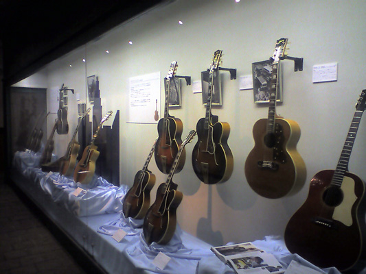 博物館の中の演奏会場となる部屋には既に前回のコンサートで使用された二台のクラヴィコードが陳列されたいました(写真1)。29日の演奏会ではその前に設置された円形のステージで私が演奏する予定です(写真2)。こちらのギターコレクションは膨大なもので、19世紀のクラシックギターのみならず、いわゆるフォークギターやジャズギターの原形となったものまで広範に渡ります(写真3-4)。写真4中央に空となったコフィンケースが見えますが、これは私がこれに入っていたシュタウファーを本日お借りしたからなのです。