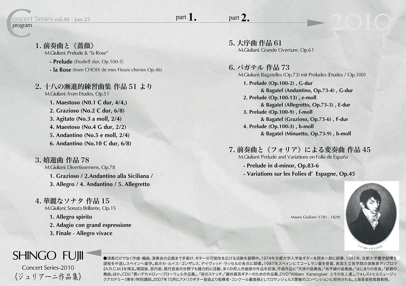 今回演奏する《薔薇Op.46》の可憐さ、《嬉遊曲Op.78》や《バガテルOp.73》の軽快さ、そして《練習曲Op.100》で聞かれる自由さは、私にとって大きな発見であり極めて新鮮な音楽でした。当時ジュリアーニの作品が沢山出版され、愛されたのは、もしかしたらこういった側面であったのかもしれないと思うのです。《華麗なソナタOp.15》や《大序曲Op.61》のような豪快さや華やかさばかりではないことを是非知って頂きたい‥・、そして昧わって頂きたいと願っています。