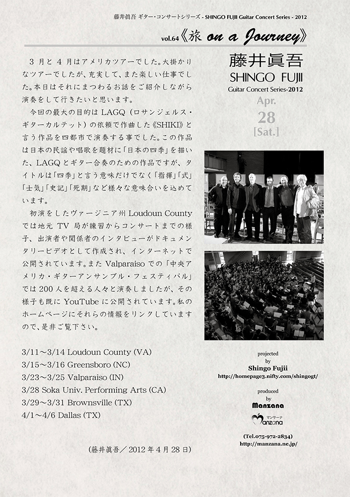 今回の最大の目的は LAGQ(ロサンジェルス・ギターカルテット)の依頼で作曲した《SHIKI》と言う作品を四都市で演奏する事でした。この作品は日本の民謡や唱歌を題材に「日本の四季」を描いた、LAGQとギター合奏のための作品ですが、タイトルは「四季」と言う意味だけでなく「指揮」「式」「士気」「史記」「死期」など様々な意味合いを込めています。