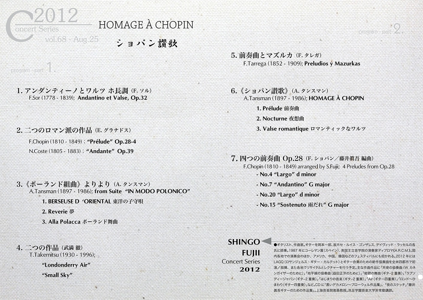 本日のプログラムを企画したとき、何の疑いもなくショパンのピアノ曲〜ギター編曲はF.タレガ版を使おうと決めていました。タレガが素晴らしい作曲家である事は周知のことですし、7月に演奏したタレガ版によるベートーベンの《月光ソナタ 第1楽章》は、「さすが!」と思わせるアイデアに溢れた素晴らしい編曲であったからです。実はF.タレガという作曲家はギターのためのオリジナル作品をはるかに凌ぐ数と量の編曲をギターのために残していて、近代ギターの父と言われる彼の音楽は、もしかしたらこういった多くの編曲作業の中から産まれて来たのではないだろうか、と思わせるほどの内容なのです。バロックの音楽から古典の巨匠達、そしてタレガと同時代のロマン派や20世紀初頭のスペインのピアニスト達の作品さえ含まれています。そのなかでショパンの作品は、前奏曲、ワルツ、マズルカなど、10曲以上を編曲していますが、今回の演奏会のためにそれらの練習を始めて見ると、「おいおい、ちょっと待てよ・・・!」ということが頻出。ピアノの原譜を引っ張り出して比較検討をしてみると、そのほとんどの編曲で、私には納得も合意も出来ないアイデアや音の変更/加筆が行われている事を発見しました。それがどういった事なのか、またどういう意味を持つのかというお話は、別の機会に譲るとして、結局私は今回の演奏会のために、ショパンの5曲のピアノ曲を自分で編曲すると言う作業に入らざるを得なくなったわけです。それは、非常に楽しく、自分自身が昔から慣れ親しんで来たショパンの音楽が、タレガの流儀ではなく、私のやり方でギターの上にその姿を現してくる、というのは「興奮する瞬間」と言っても過言ではありませんでした。
