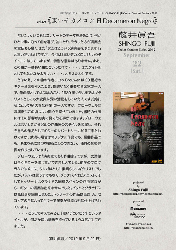 だいたい、いつもはコンサートのテーマを決めたり、何かひとつ事に沿って曲を選び、並べたり、そうした方が演奏会の宣伝もし易く、また「次回はこういう演奏会をやります!」と言い易いわけですが、今回は《黒いデカメロン》というタイトルにはしていますが、特別な意味はありません。まあ、この曲が一番長い曲だというだけで・・・、またタイトルとしてもなかなかよろしい・・・、と考えたわけです。