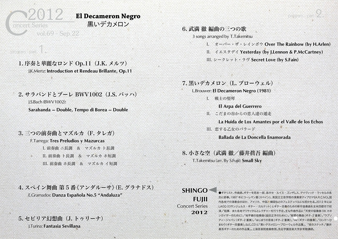 ブローウェルは「演奏家であり作曲家」ですが、武満徹は全くギターを弾く事ができませんでした。前半のプログラムではメルツ、タレガはともに素晴らしいギタリストでしたが、バッハは言うまでもなく、グラナドスはピアニスト、そしてトゥリーナはグラナドス同様スペインの作曲家ながら、ギターの演奏は出来ませんでした。バッハとグラナドスは私自身が編曲しました。トゥリーナの作品は巨匠A.セゴビアの手によってギターで演奏が可能な形に仕上げられています。