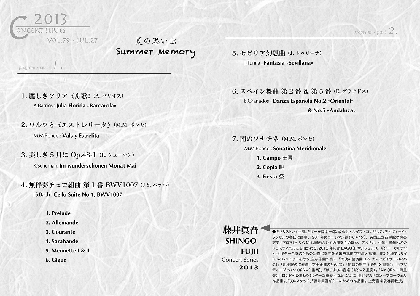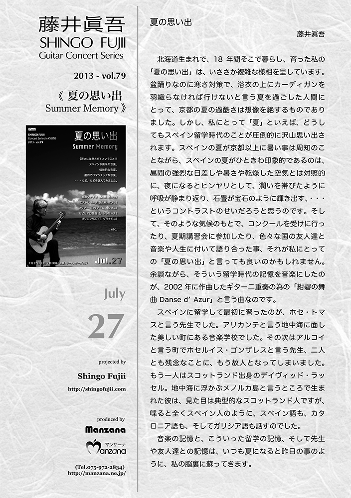 北海道生まれで、18年間そこで暮らし、育った私の「夏の思い出」は、いささか複雑な様相を呈しています。盆踊りなのに寒さ対策で、浴衣の上にカーディガンを羽織らなければ行けないと言う夏を過ごした人間にとって、京都の夏の過酷さは想像を絶するものでありました。しかし、私にとって「夏」といえば、どうしてもスペイン留学時代のことが圧倒的に沢山思い出されます。スペインの夏が京都以上に暑い事は周知のことながら、スペインの夏がひときわ印象的であるのは、昼間の強烈な日差しや暑さや乾燥した空気とは対照的に、夜になるとヒンヤリとして、潤いを帯びたように呼吸が静まり返り、石畳が宝石のように輝き出す、・・・というコントラストのせいだろうと思うのです。そして、そのような気候のもとで、コンクールを受けに行ったり、夏期講習会に参加したり、色々な国の友人達と音楽や人生に付いて語り合った事、それが私にとっての「夏の思い出」と言っても良いのかもしれません。余談ながら、そういう留学時代の記憶を音楽にしたのが、2002年に作曲したギター二重奏の為の「紺碧の舞曲 Danse d’Azur」と言う曲なのです。