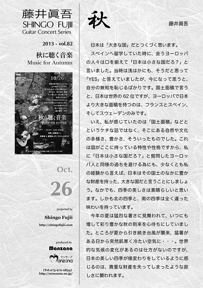 いえ、私が感じていたのは「国土面積」などとというケチな話ではなく、そこにある自然や文化の多様さ、豊かさ、そういったものでした。これは国がここに持っている特性や性格ですから、私に「日本は小さな国だろ?」と質問したヨーロッパ人と同様の過ちを避ける為にも、少なくとも私の経験から言えば、日本はその国土のなかに豊かな財産を持った、大きな国だと言うことにしましょう。なかでも、四季の美しさは素晴らしいと思います。しかも北の四季と、南の四季は全く違った味わいを持っています。