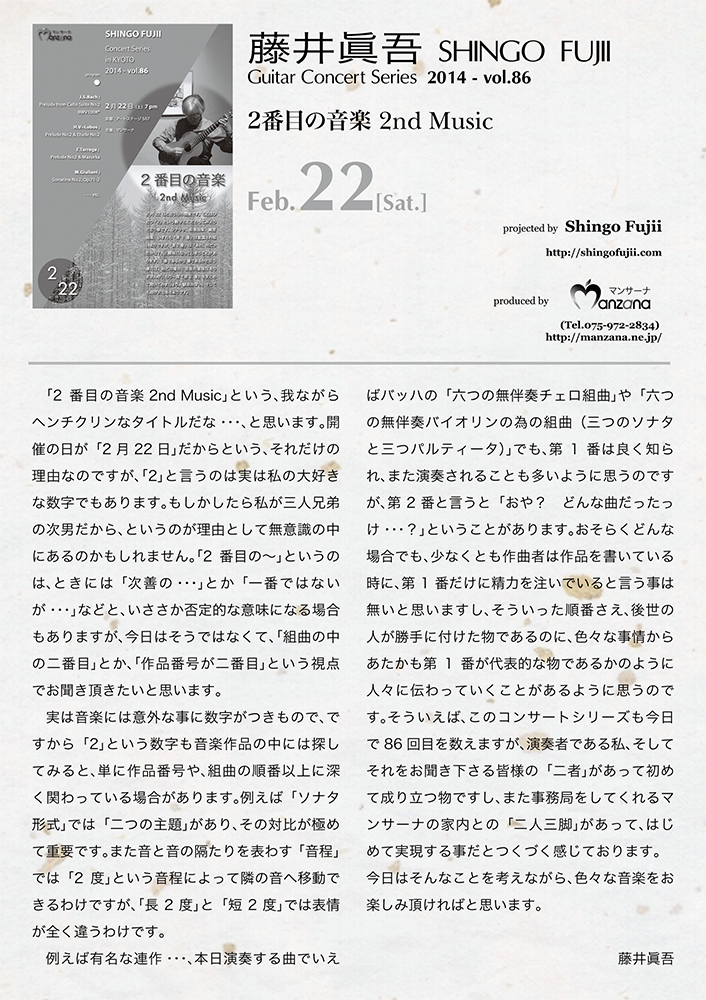 例えば有名な連作・・・、本日演奏する曲でいえばバッハの「六つの無伴奏チェロ組曲」や「六つの無伴奏バイオリンの為の組曲(三つのソナタと三つパルティータ)」でも、第1番は良く知られ、また演奏されることも多いように思うのですが、第2番と言うと「おや? どんな曲だったっけ・・・?」ということがあります。おそらくどんな場合でも、少なくとも作曲者は作品を書いている時に、第1番だけに精力を注いでいると言う事は無いと思いますし、そういった順番さえ、後世の人が勝手に付けた物であるのに、色々な事情からあたかも第1番が代表的な物であるかのように人々に伝わっていくことがあるように思うのです。そういえば、このコンサートシリーズも今日で86回目を数えますが、演奏者である私、そしてそれをお聞き下さる皆様の「二者」があって初めて成り立つ物ですし、また事務局をしてくれるマンサーナの家内との「二人三脚」があって、はじめて実現する事だとつくづく感じております。