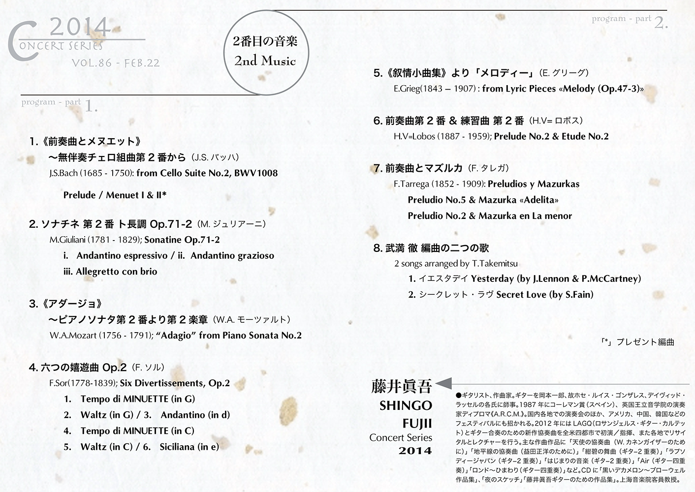 「2番目の音楽 2nd Music」という、我ながらヘンチクリンなタイトルだな・・・、と思います。開催の日が「2月22日」だからという、それだけの理由なのですが、「2」と言うのは実は私の大好きな数字でもあります。もしかしたら私が三人兄弟の次男だから、というのが理由として無意識の中にあるのかもしれません。「2番目の〜」というのは、ときには「次善の・・・」とか「一番ではないが・・・」などと、いささか否定的な意味になる場合もありますが、今日はそうではなくて、「組曲の中の二番目」とか、「作品番号が二番目」という視点でお聞き頂きたいと思います。