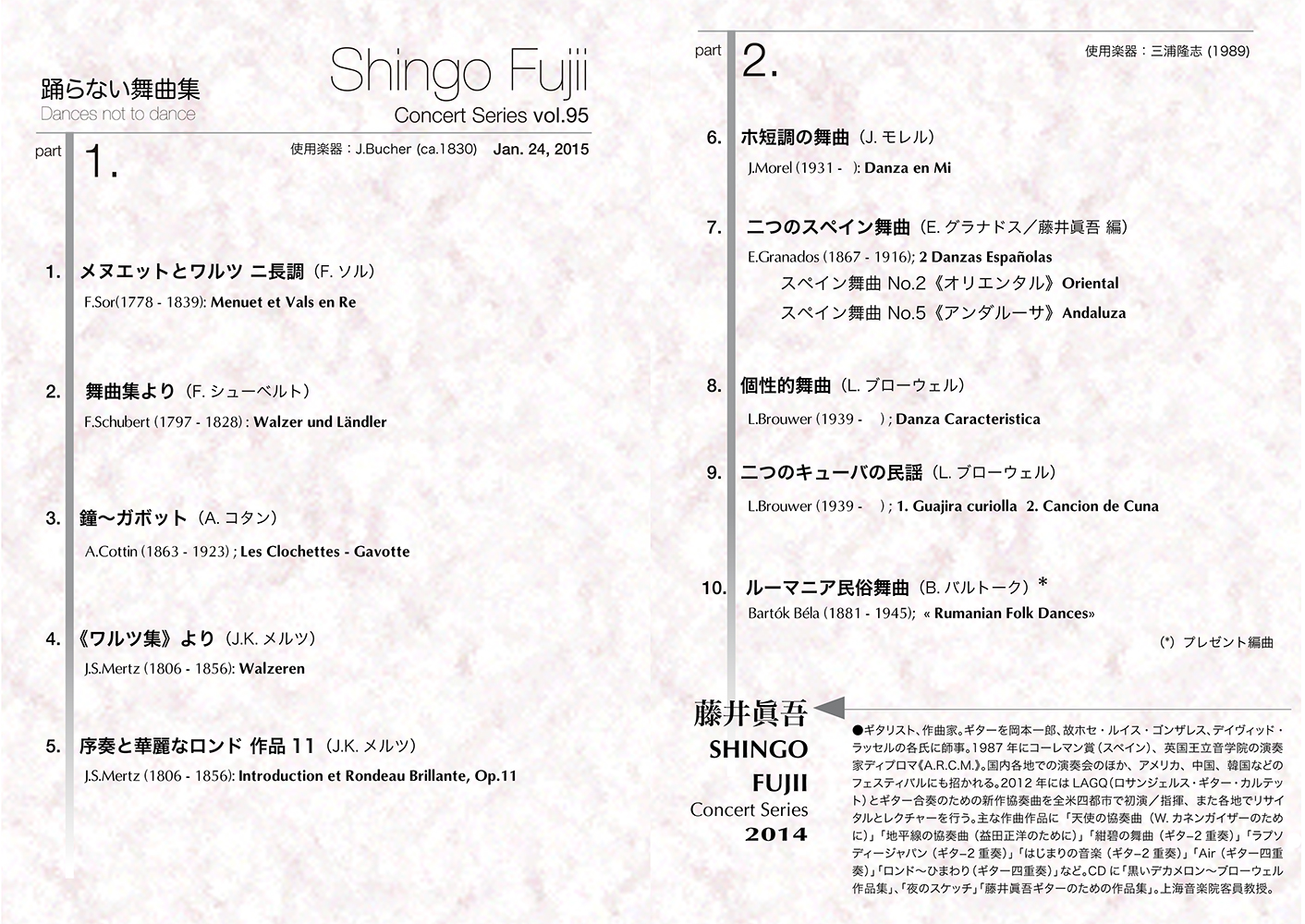 今回は《踊らない舞曲集》という、ちょっと諧謔的なタイトルにしてみましたが、あまり深い意味はありません。文字通り、「現在私達がギターで演奏している《舞曲》のほとんどは、実際に誰かが踊るために作られた音楽ではない・・・」と言うくらいの意味なのですが、それでも本日のプログラムの中で言えば、シューベルトの音楽は決してそうでは無く、社交界などの場で実際に踊ることを目的として書かれた数ある舞曲集にふくまれるものですし、バルトークの民俗舞曲集は、少なくとも「舞曲」としての本質を少しも失っていないものであろうと思われます。