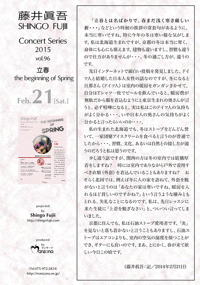 京都に住んでも、私は石油ストーブ愛用者です。「炎」を見ないと落ち着かないと言うこともありますし、石油ストーブはエアコンよりも、室内の空気の湿度を保つことができ、ギターにも良いのです。まあ、とにかく、春が来て欲しい今日この頃です。