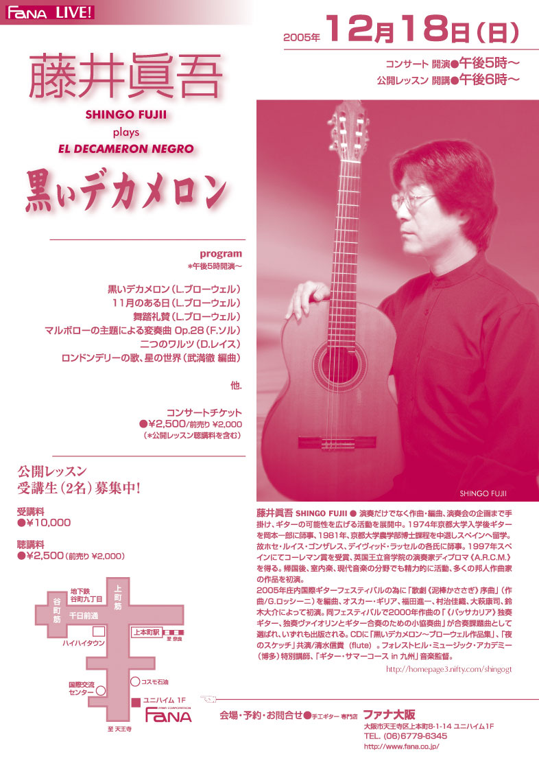 2005年12月18日(日) 午後5時〜(コンサート) 午後6時〜(公開レッスン) 会場● ファナ大阪(地図) 大阪市天王寺区上本町8-1-14 ユニハイム1F http://www.fana.co.jp/ 料金●¥2,500/前売り¥2,000(レッスン聴講料を含む/20名) 出演●藤井眞吾 予約・お問合せ●TEL. (06)6779-6345 /ファナ大阪 曲目● 黒いデカメロン(L.ブローウェル)/11月のある日(L.ブローウェル)舞踏礼賛(L.ブローウェル)/マルボローの主題による変奏曲 Op.28(F.ソル)/二つのワルツ(D.レイス) 他.