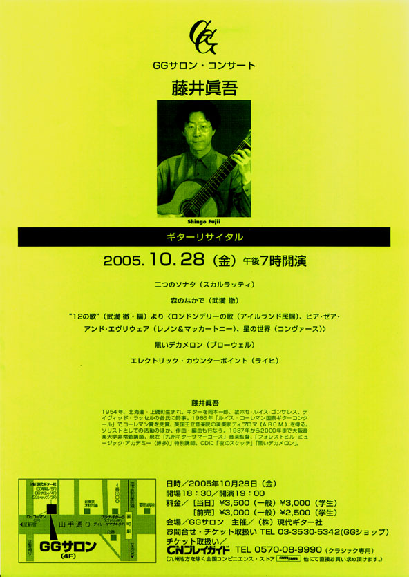 ●料金/当日/¥3500=一般/¥3000=学生 /前売/ ¥3000=一般/¥2500=学生 ●会場/GGサロン ●主催/(株)現代ギター社 ●お問合せ・チケット取り扱い/03-3530-5342(GGショップ)