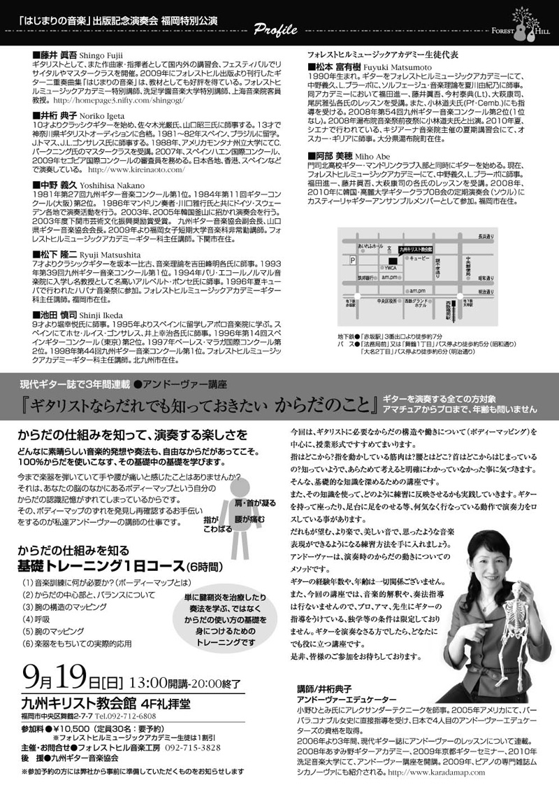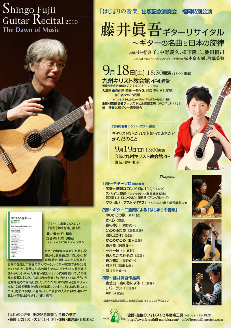 ギター二重奏曲集「はじまりの音楽」が出版されて一年が経ちます。9月は出版記念コンサートシリーズの第2弾が開催されますが18日は出版元のフォレストヒルがある福岡市で、この曲集を執筆依頼して下さったギタリストの井桁典子さんにも共演いただき、またフォレストヒルミュージックアカデミーの三人のギタリスト、中野義久氏、松下隆二氏、池田慎司氏にも出演いただいて、「はじまりの音楽」と、私の自作作品三曲を演奏するという特別プログラムです。