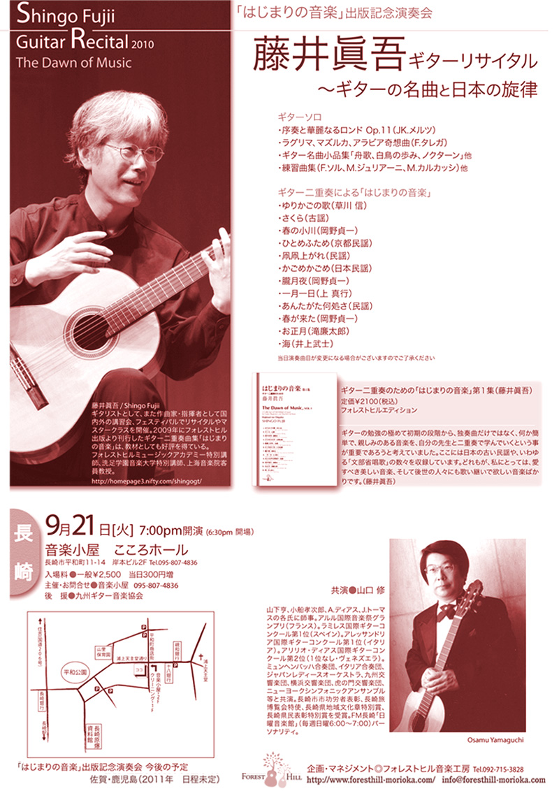 ギター二重奏曲集「はじまりの音楽」が出版されて一年が経ちます。出版記念コンサートシリーズの第2弾、9月18日は福岡市で、そして21日は長崎市です。大変名誉なことに、山口修先生が共演をして下さいます。皆様、是非聞きにいらして下さい。