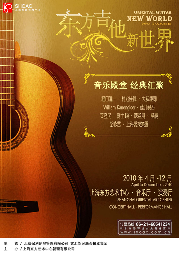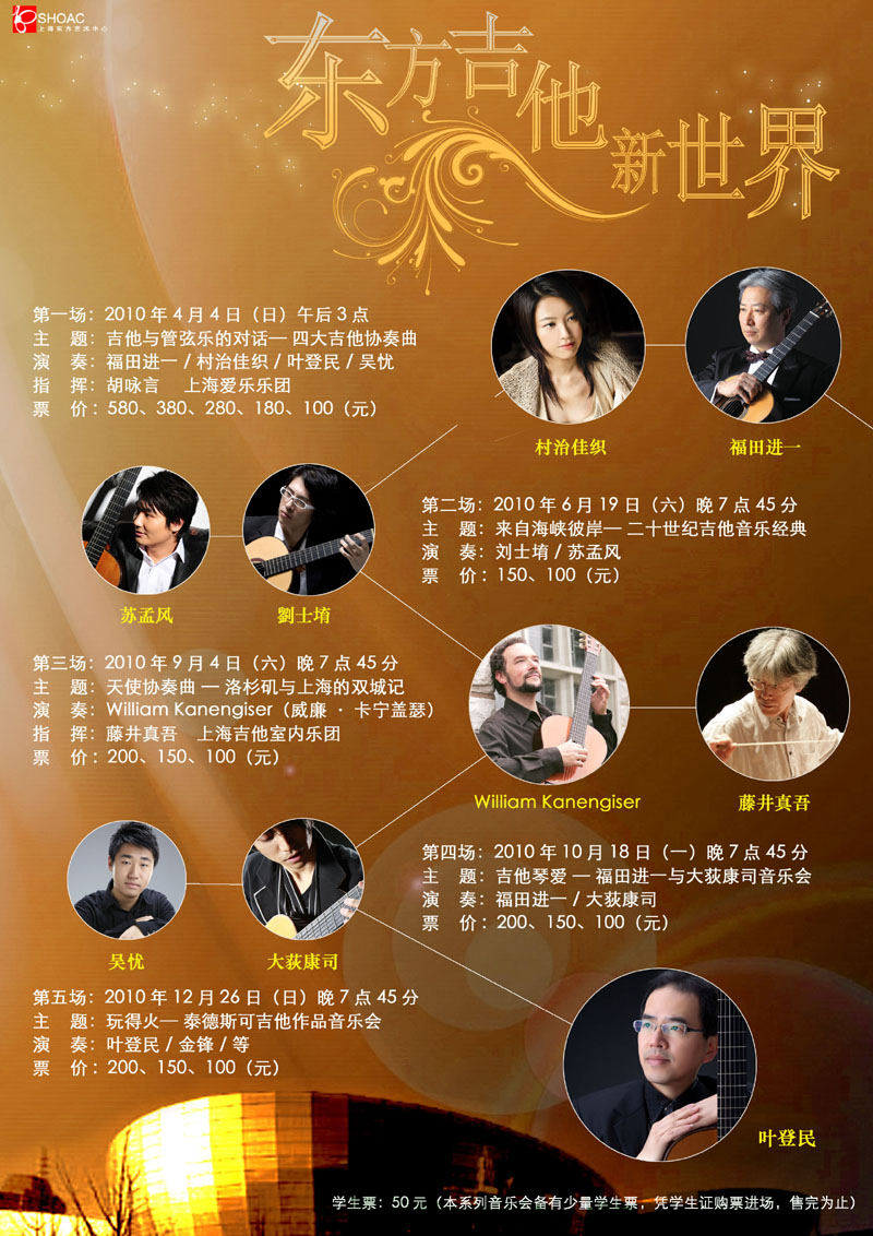 2010年度、中国は上海市のオリエンタルアートセンターの主催でギターのコンサートシリーズが開催されます。すでに第1回(4月)と第2回(6月)が行われ、私は9月4日の第3回に出演します。メインゲストはW.カネンガイザー氏で、私はその共演者として、私の作曲した「紺碧の舞曲(二重奏)/カネンガイザー氏と共演」「リバーラン(三重奏)/カネンガイザー氏、葉登民氏と共演」、そして上海音楽院の学生達によるギターオーケストラと「天使の協奏曲」で指揮をします。