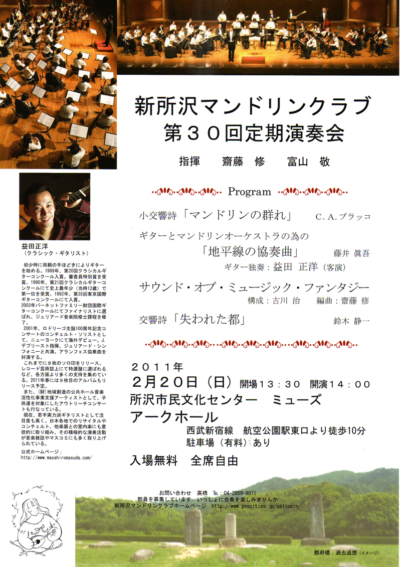 2009年に作曲した独奏ギターとマンドリン合奏の為の「地平線の協奏曲」が、2011年2月20日に新所沢マンドリンクラブによって演奏されます。