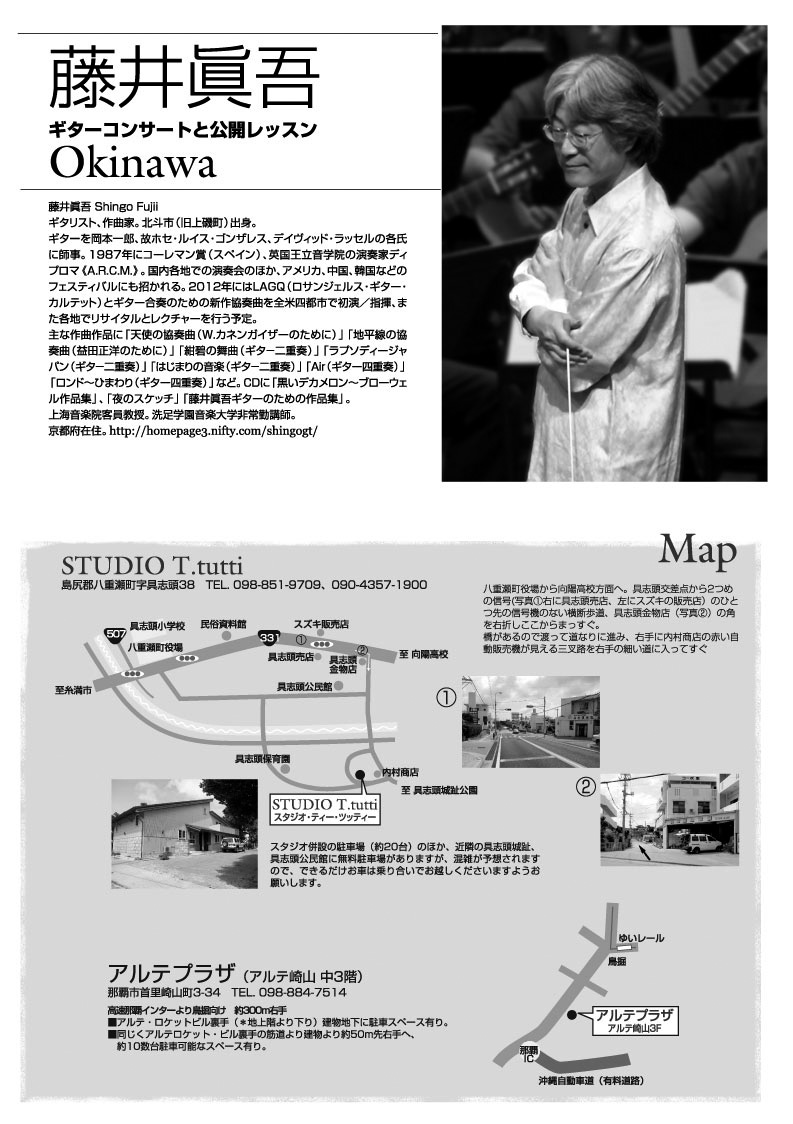 日時●2011年●12月18日(日)11:00〜17:00 (予定) チケット●受講12,000円、聴講1,000円 主催・お問合せ●藤井眞吾沖縄コンサート実行委員会 TEL 090-9406-0592(又吉) メール tarom@me.com 会場● アルテ赤田ギャラリーホール(那覇市首里赤田町3-26) *アルテプラザから変更になりました、ご注意ください