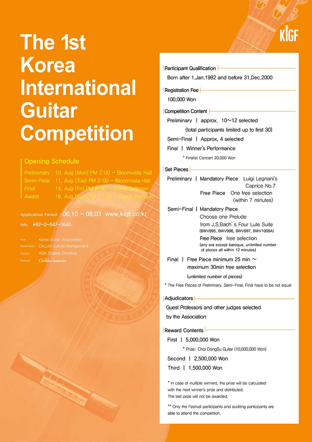 韓国ギター協会の主催による「第1回 韓国 国際ギタ−・フェスティバル」と「第1回 韓国 国際ギタ−・コンクール」が8月10日から16日にかけて、ソウル市の近郊の町で開催されます。イタリアの巨匠、オスカー・ギリア氏、イギリス出身のポール・ガルブレイス氏、フランスのジュディ・カエル・ペロワ氏、韓国のリー・ソンウ氏、そして我が国から福田進一氏など多彩な顔ぶれが揃います。私はアンサンブルクラスとマスタークラスを持ちます。