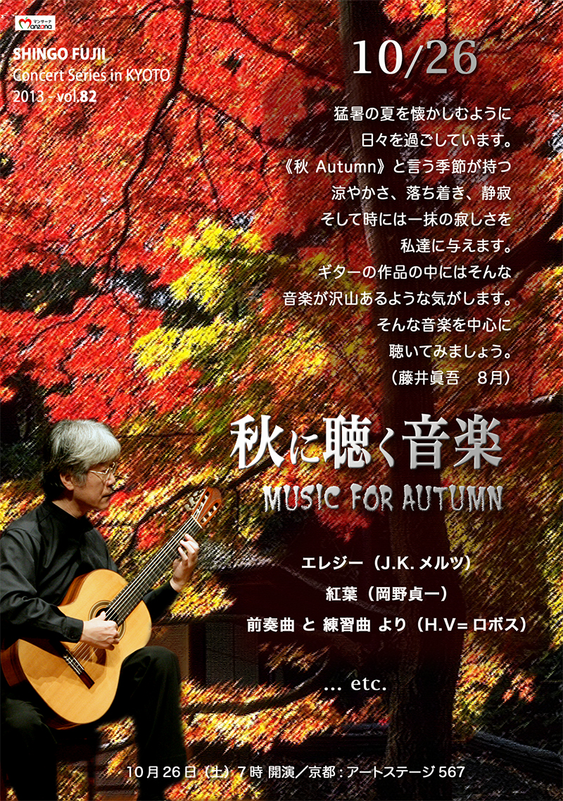 猛暑の夏を懐かしむように日々を過ごしています。《秋 Autumn》という季節が持つ、涼やかさ、落ち着き、静寂、そして時には一抹の寂しさを私達に与えます。ギターの作品の中にはそんな音楽が沢山あるような気がします。そんな音楽を中心にお聞きください。 (藤井眞吾 8月)