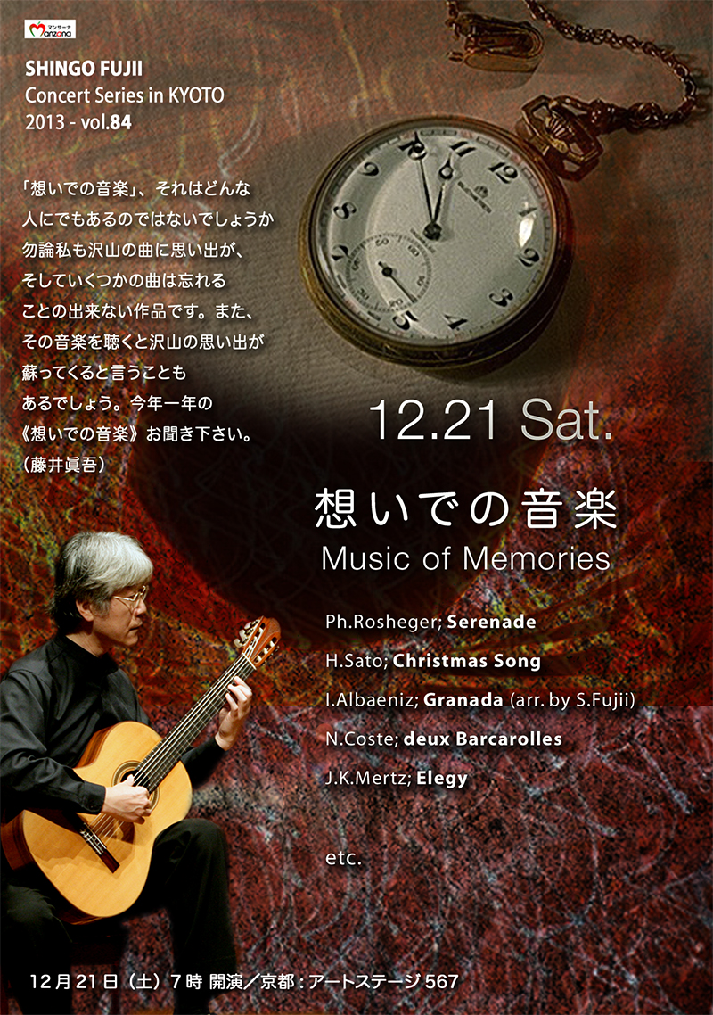 「想いでの音楽」、それはどんな人にでもあるのではないでしょうか。勿論私も沢山の曲に思い出が、そしていくつかの曲は忘れることの出来ない作品です。また、その音楽を聴くと沢山の思い出が蘇ってくると言うこともあるでしょう。今年一年の《想いでの音楽》お聞き下さい。 (2013/09/23)