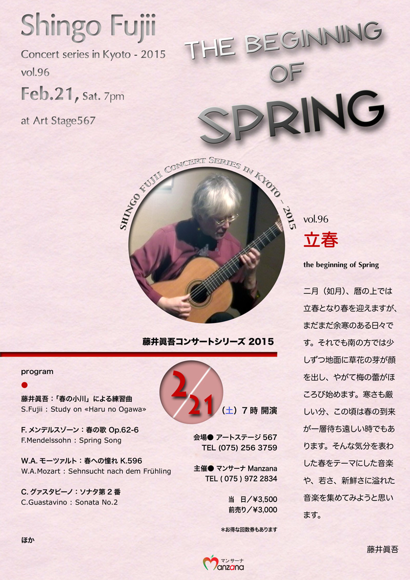 藤井眞吾が京都の«Art Stage 567(アートステージ・コロナ)»を会場に、毎月開催するコンサート・シリーズです。30名も入ればいっぱいになる可愛らしいスペースですが、木造りの空間は落ち着いた雰囲気を持ち、ギターの緻密な響きを余すところなく堪能させてくれます。コンサートホールでのリサイタルとはひと味違った個性的で贅沢ななプログラムをお楽しみください。