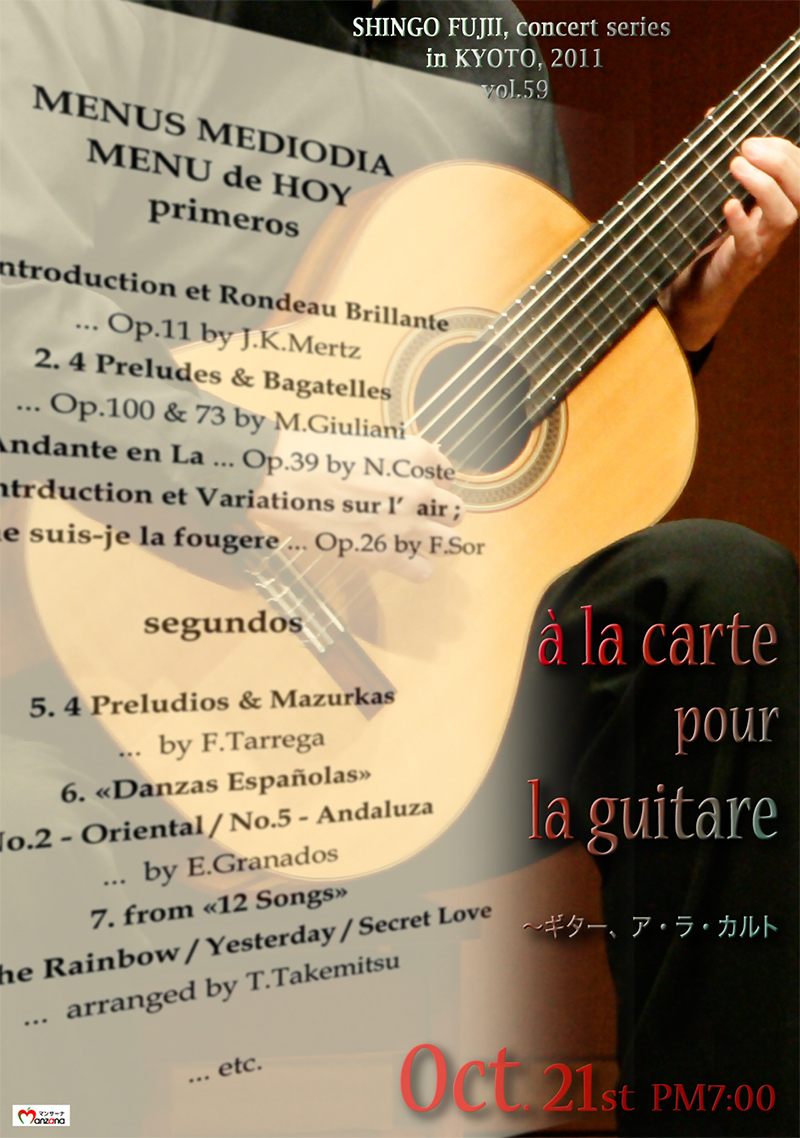 「ア・ラ・カルト」本当だったら客席の皆様のご希望に応えながら演奏したいところですが、そうも参りません。クラシックから現代まで、様々な曲をご堪能下さい。ジュリアーニから、タレガ、そしてグラナドスや武満まで、広範なギター曲を網羅します。(藤井眞吾/8月)