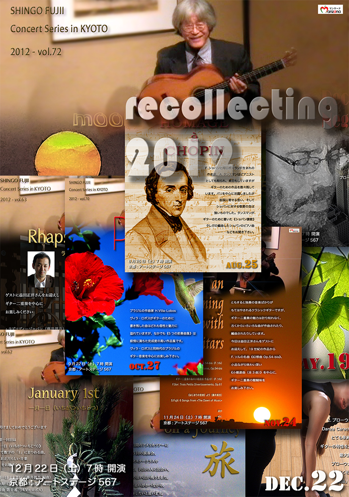 今年一年間のプログラムの中からピックアップして演奏します。どんな構成になるかは、まだ決めていませんが、2012年の様々な出来事を回想しながら、作品のひとつひとつとの語り合いをしていきたいと思います。そこで、皆さんには今年のプログラムを今一度ご覧戴いて、曲目の予想などしてお楽しみ頂けたら・・・、などと勝手に思っております。