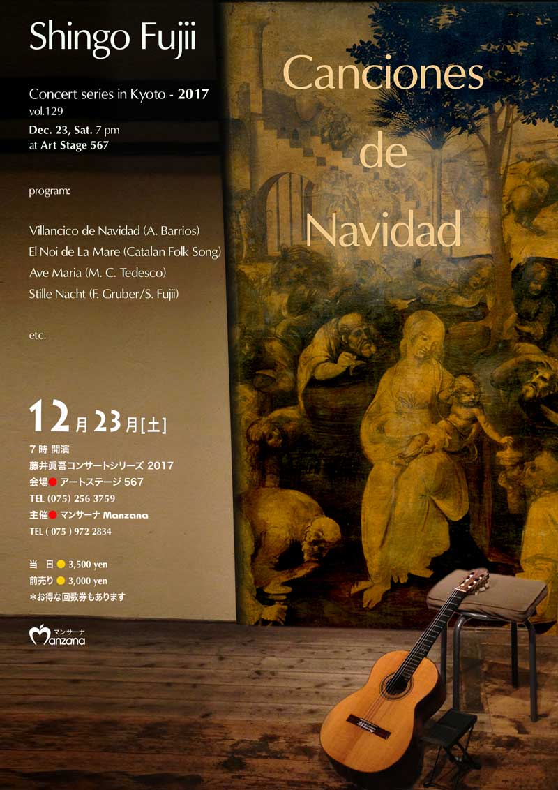 2017年も残すところ一週間、クリスマス・イブの前日です。クリスマスの歌、冬の歌、などを特集してみようと思います。スペインはカトリックの国ですから、クリスマス(聖誕祭)に関連した音楽が沢山あります。ギターのための作品と、一般的に知られたクリスマスの歌をギターのために少し編曲してお聞き頂こうと思います。今年最後のコンサートシリーズを、静かに、お楽しみ頂ければと思っています。