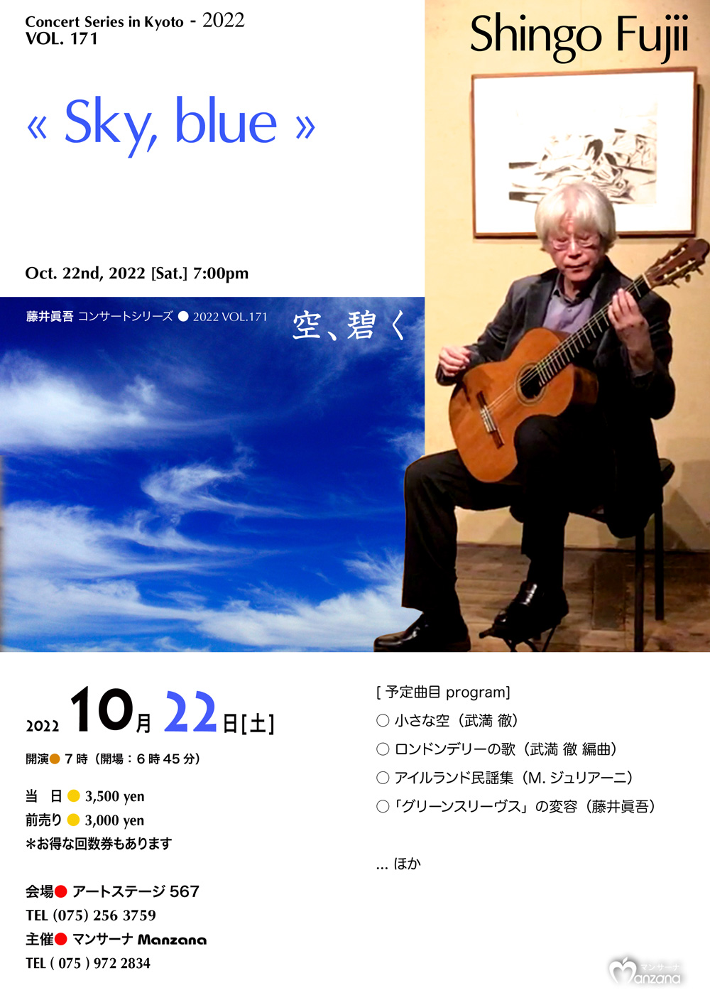 ●program(予定)/小さな空(武満 徹)/ロンドンデリーの歌(武満 徹 編曲)/アイルランド民謡集(M.ジュリアーニ)練習曲集より(M.カルカッシ)/グリーンスリーブスの変容(藤井眞吾)