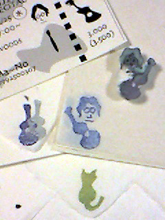 Ma-no の「S」さんには5年前にもお世話になっています。今回会場に到着すると、前回のチケット(Sさんのデザイン)、そしてこの日のために「私の顔」「ギター」そして「猫」のイラスト入り、封筒や葉書便箋を作って下さっていました。このイラストは「ハンコ」になっていて、周囲の人に言わせると「激似」だそうです。