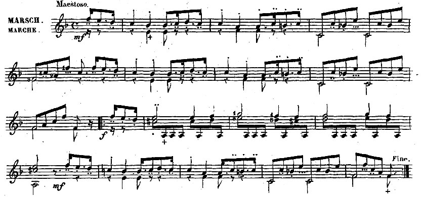 再び「行進曲」です。マーチのテンポで弾けるように、ゆったりしたテンポで構いません。しかし最初の旋律の頭は少し変わったアウフタクト、リズムをしっかりと理解しましょう。1拍目から2拍目にかけてはレガートで。