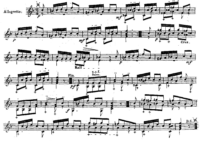 ここから「へ長調」です。ギターを始めたばかりの頃はフラット(b)のついた調号は見ただけで嫌になったものですが、慣れてしまえばそれほど弾くにくくはないですし、また平行調の「ニ短調」はしばしば使われるキーです。実際、この曲でも後半はニ短調です。