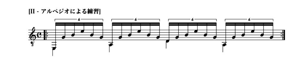 アルペジオの音形は無数にあるわけですから、様々な形で同様の練習をしてみるのは有効でしょう。しかし上に挙げた例は、アルペジオの基本的動作を網羅しているので、この音形は必ず練習するようにしましょう。