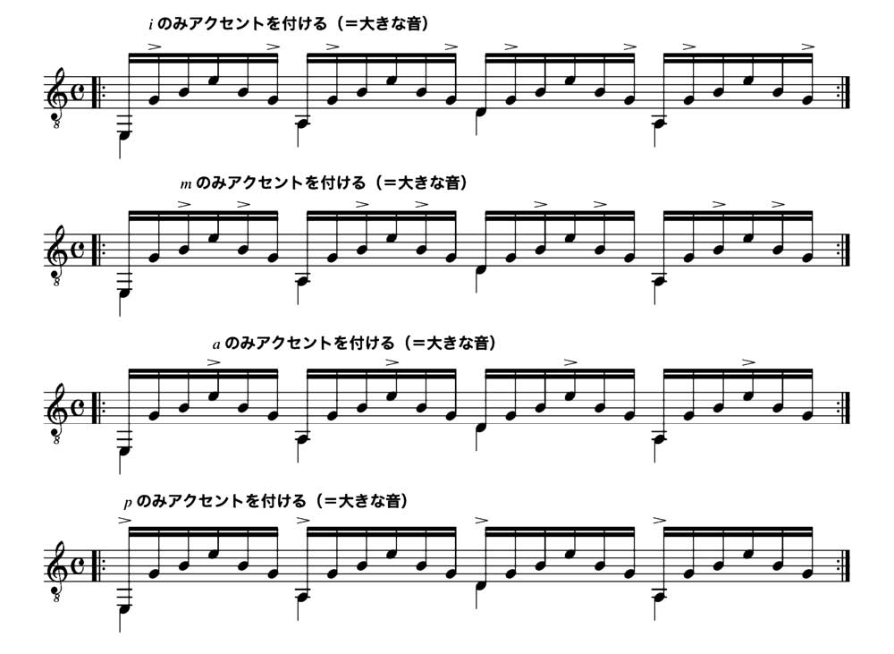 ・・・などの変化をさせなさい。また以下の例のようにアクセントを加えたり、細かなダイナミックスの変化も練習しなさい。