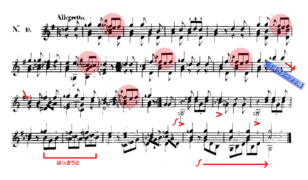 曲調は終始、ト長調で明るく軽やかなのですが、後半の4小節目の2拍目から、旋律が突然1弦の高いポジションの「シ」に上昇したかと思うと、急降下するように1オクターブ下の「シ」に下がるところは、一時的にホ短調に転調したような効果とともに、音楽の表情が変化するところです。ここはとても美しいと思います。