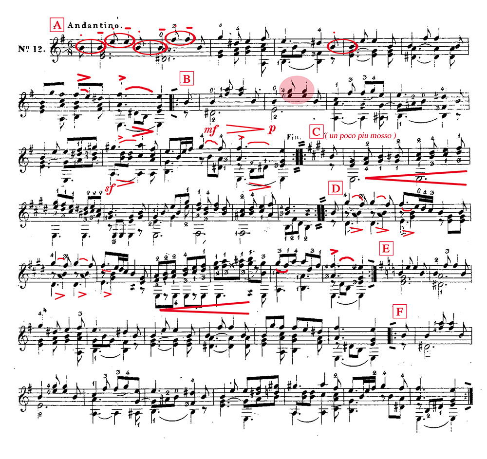 曲はどのセクションも旋律は八分音符のアウフタクトから始まります。「A」の最初の「シ→シ」「ミ→ミ」など同度は最初の音を短めに(スタッカート)、次の音を十分にテヌートした方がリズムが軽やかになります。またそういったアーティキュレーションは時代の習慣でもありました。テンポは速くならないよう、Andantino ですがゆったりした気分を失わないように。