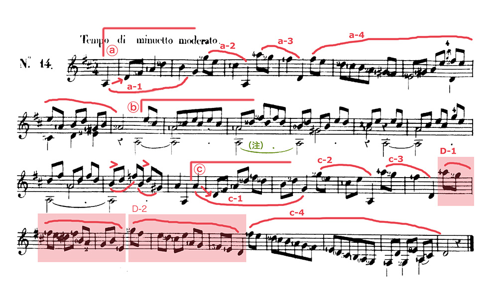 ⓐの部分は8小節で、最初の4小節(a-1、a-2、a-3)と次の4小節(a-4)が対照的です。「a-1」では属音「ラ」から主音「レ」へジャンプしますが、その時両方の音を5弦、4弦とそれぞれ開放弦で弾いたとしても、1拍目の「レ」の時前の「ラ」が残っていないようにしましょう。両方を5弦で弾けば簡単にその問題は避けられますが・・・。この最初の旋律は主和音の分散「レ-ファ#-ラ」です。「a-2」は属和音、「a-3」で主和音に戻ります。「a-4」は4小節にまたがる長いフレーズです。属調、イ長調に転調します。ⓐでの、前半と後半の旋律の表情が違う事に注意しましょう。