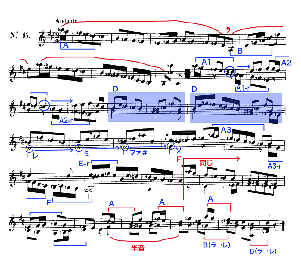 後半はまた主調(ニ長調)に戻って、その属和音で開始されたと考えられますが(A1)、「レ」に「#」がついてその応答(A1-r)はホ短調の属和音が聞こえ、次の小節では転調したかのように感じますが(A2)、その応答(A2-r)は再び主調(ニ長調)に導きます。