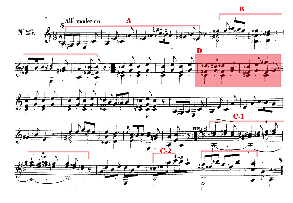 楽曲の性格を判断するとき、旋律の「形 figure」はしばしば大きな手がかりとなります。もうひとつの手がかりは「発想記号」。この曲では「Allegro moderato」ですから「快活に、しかし穏やかに」ということです。また 6/8 という拍子は時に、難しい場合があります。この曲はテンポが速すぎるとアグレッシブな印象を与えてしまいますので注意しましょう。
