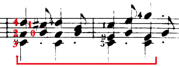 ・・・と転調し、ダル・セーニョの後、終わります。どれも単純な転調ですが、そのお陰で曲は単調でありながら、一種の爽快感があります。特に二つ目の部分は平行調のハ長調に転調しますが、主音(ド)のペダル上で繰り返される長三度の反復は、快活です。低音ペダルの効果を完全なものにするために(D)、以下のような指使いをお薦めします。