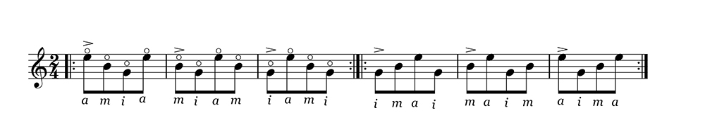 【課題 1-2】は先の課題と同じことに気をつけながら同様に練習します。これはいわゆる「アルペジオ」を弾く場合ですが、基本的には全てアル・アイレ奏法で練習します。ただしアクセントは毎回指が交互に変わります。